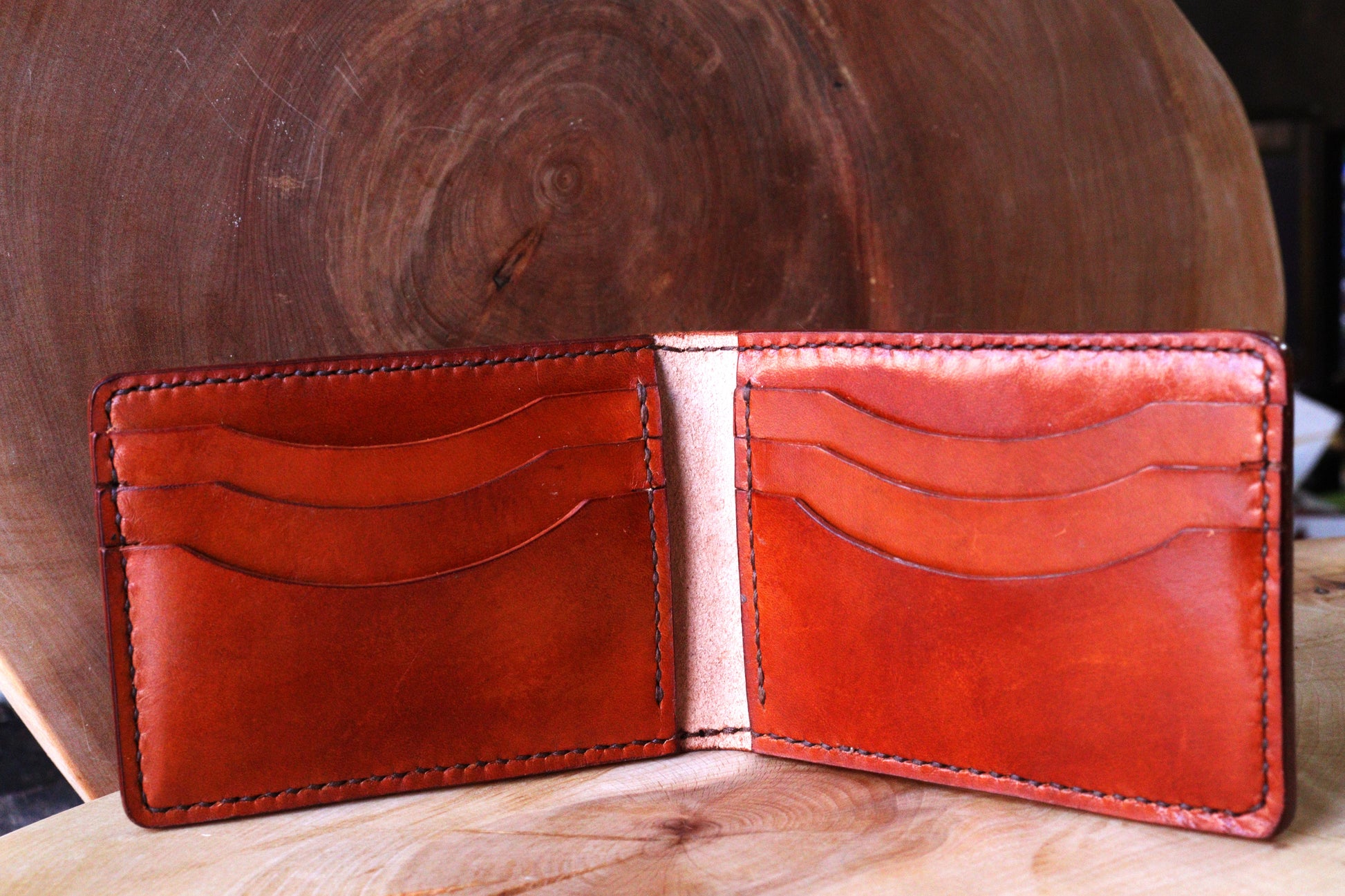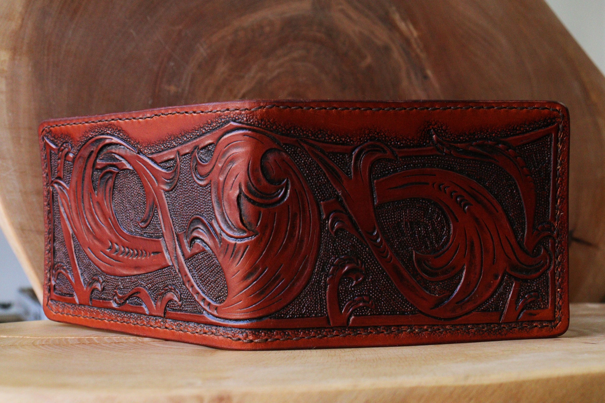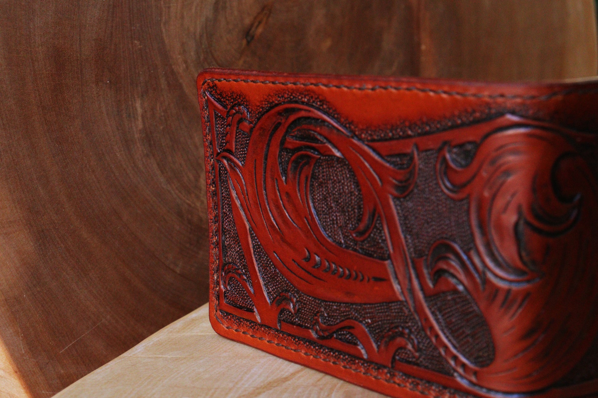 Porte carte en cuir végétale pleine fleur ciselé à la main avec un motif floral.